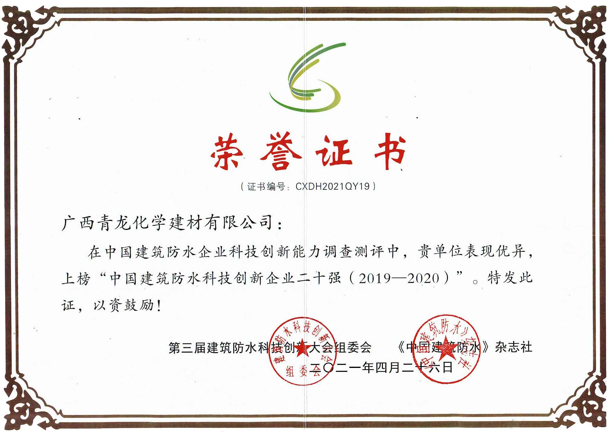 中國建筑防水科技創(chuàng)新企業(yè)二十強(qiáng)(2019-2020)