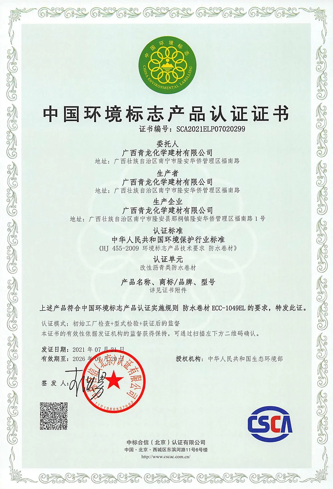 中國環(huán)境標(biāo)志產(chǎn)品認(rèn)證證書